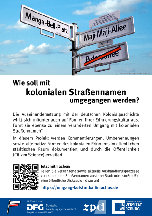 Projekthomepage und Poster zum DFG-Projekt "Informieren, Dokumentieren, Beraten: Integrierte Namen-, Text- und Bilddatenbank über den Umgang mit kolonialen Straßennamen seit 1945 bis heute".